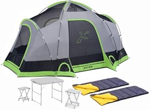 Product Description : Kit includes the 6-Person "Vista" Family Tent, sturdy aluminum portable table & stools set, along with 2 color coordinated "Solo" 3 lb sleeping bags. Bags can be ziped together to create one oversized bag for couples.