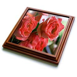 Product Description : Size: 8x8 Trivet with 6x6 ceramic tileThree Deep Pink Roses Trivet is measuring 8w x 8h x .75d. Made of solid wood with padding on back that protects your furniture. Framed trivet comes with 6w x 6h ceramic gloss tile attached to the wood frame.