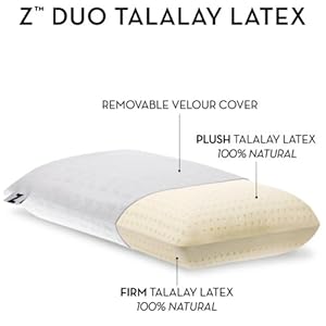 Product Description : : Size: QueenZ Talalay Latex pillows are created through an eco friendly manufacturing process using latex derived from sustainable rubber trees. The milky sap tapped from these tropical trees is whipped, poured into a mold, chilled, and finally heated to set the unique foam consistency. Due to its proprietary production process, Talalay is the most resilient and consistent latex.100% Natural Talalay latex two-sided pillowDistinct feel on each side with either plush or firm supportDual-ComfortTM Technology offers different levels of support for multi-position sleepersPin-core design promotes increased air circulation and breathabilityOffers superior pressure relief and can eliminate sleeping painNaturally hypoallergenic, antimicrobial and dust mite resistantBreathable and maintains a comfortable sleeping temperatureProvides optimal support by conforming to your body contoursResponds instantly to your movementsLuxuriously soft, embossed removable velour cover5-Year warranty